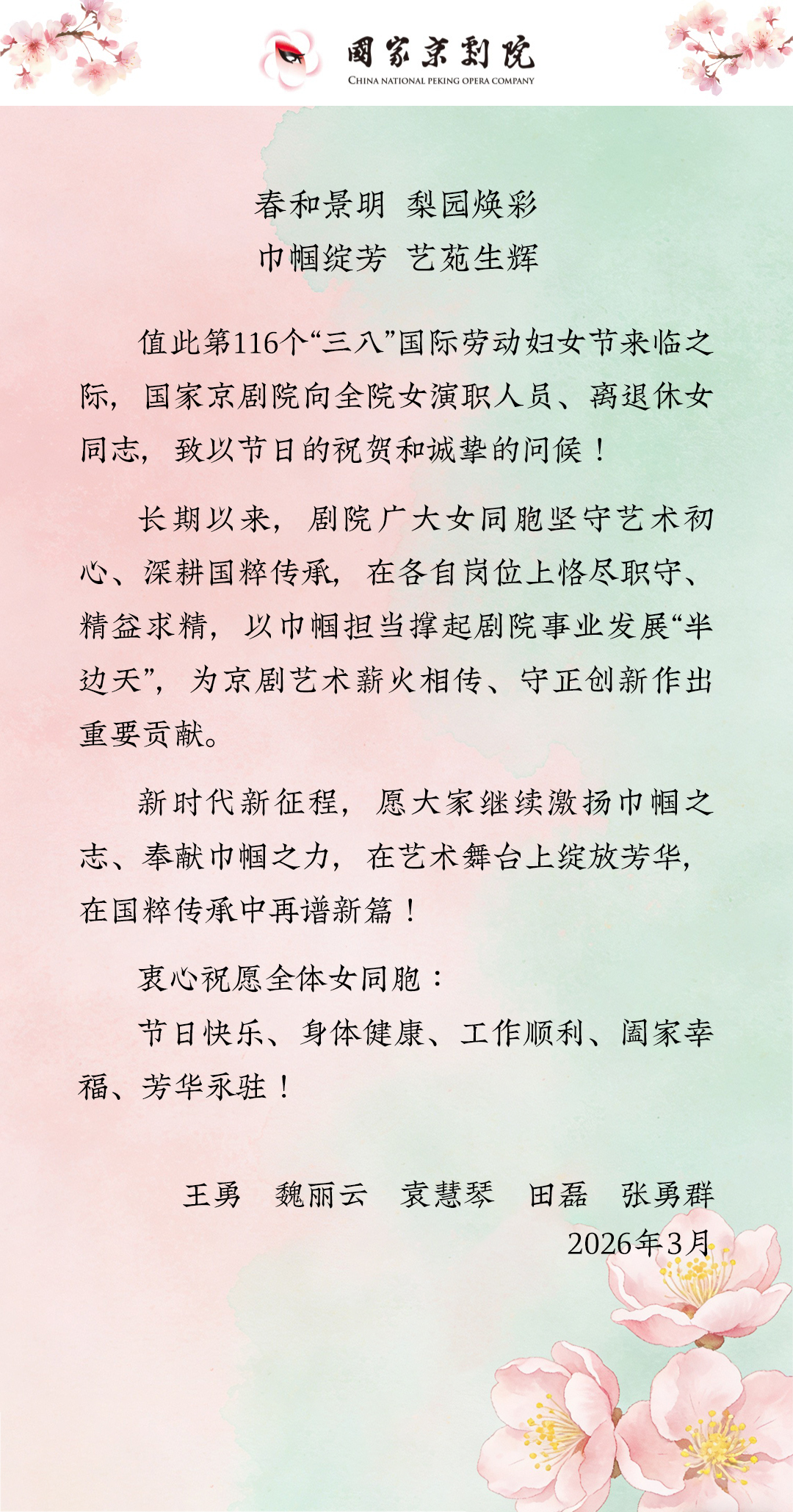 国家京剧院向全院女演职人员、离退休女同志,致以节日的祝贺和诚挚的问候!