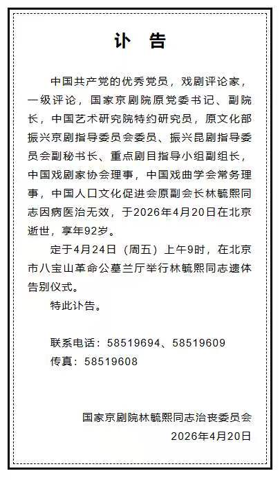 中国共产党的优秀党员,戏剧评论家,一级评论,国家京剧院原党委书记、副院长,中国艺术研究院特约研究员,原文化部振兴京剧指导委员会委员、振兴昆剧指导委员会副秘书长、重点剧目指导小组副组长,中国戏剧家协会理事,中国戏曲学会常务理事,中国人口文化促进会原副会长林毓熙同志因病医治无效,于2026年4月20日在北京逝世,享年92岁。